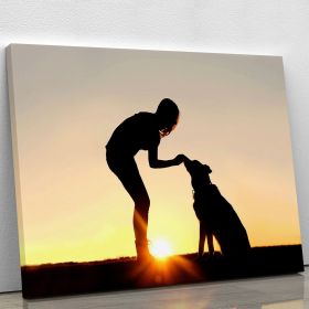 A silhouette of a girl sitting outside in the grass with her pet German Shepherd Mix Dog feeding him treats during training in front of a sunsetting s (type: Standard Framed Canvas Print, size: 40" x 26" / 100cm x 65cm (approx))