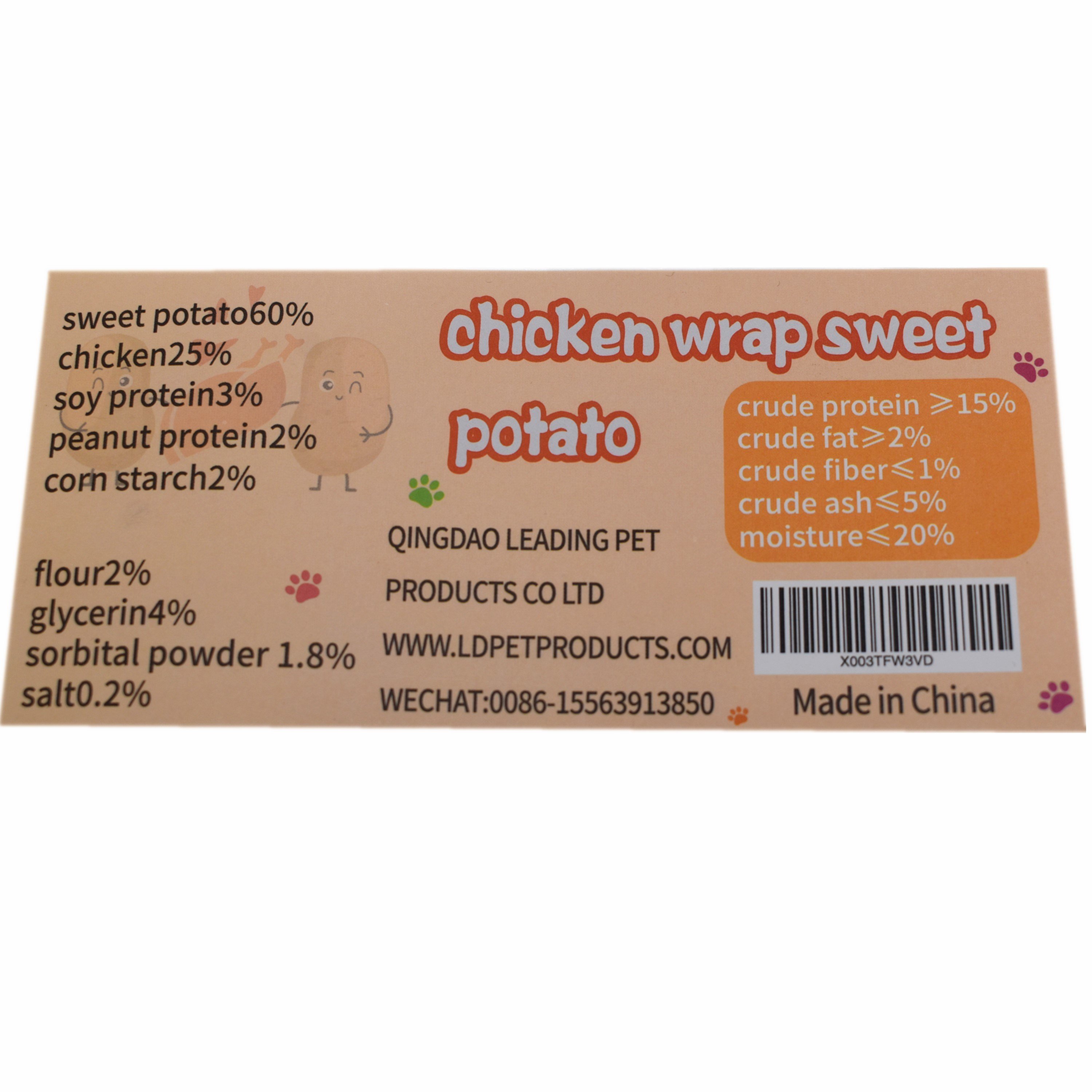 Pet snack is very popular among dogs. Dog treats can be used as a training prop for dogs, but also can enhance the bond between dogs and owners. Dog snacks is a very good food.Composition: sweet potato60% chicken25% soy protein3% peanut protein2% corn starch2% flour2% glycerin4% sorbital powder 1.8% salt0.2%.