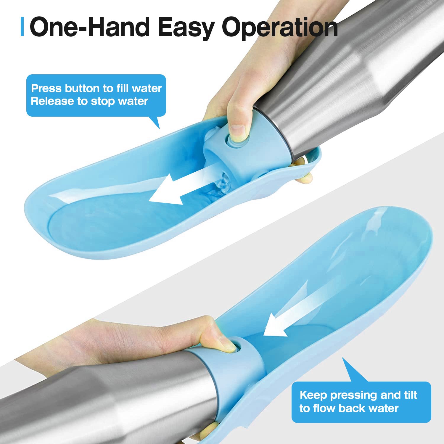 *One-Hand Operation*:One button to operate,press button to fill water,release to stop water. And to save energy and avoid wasting water,the unused water can flow back into the bottle by keep pressing the button and tilt back.